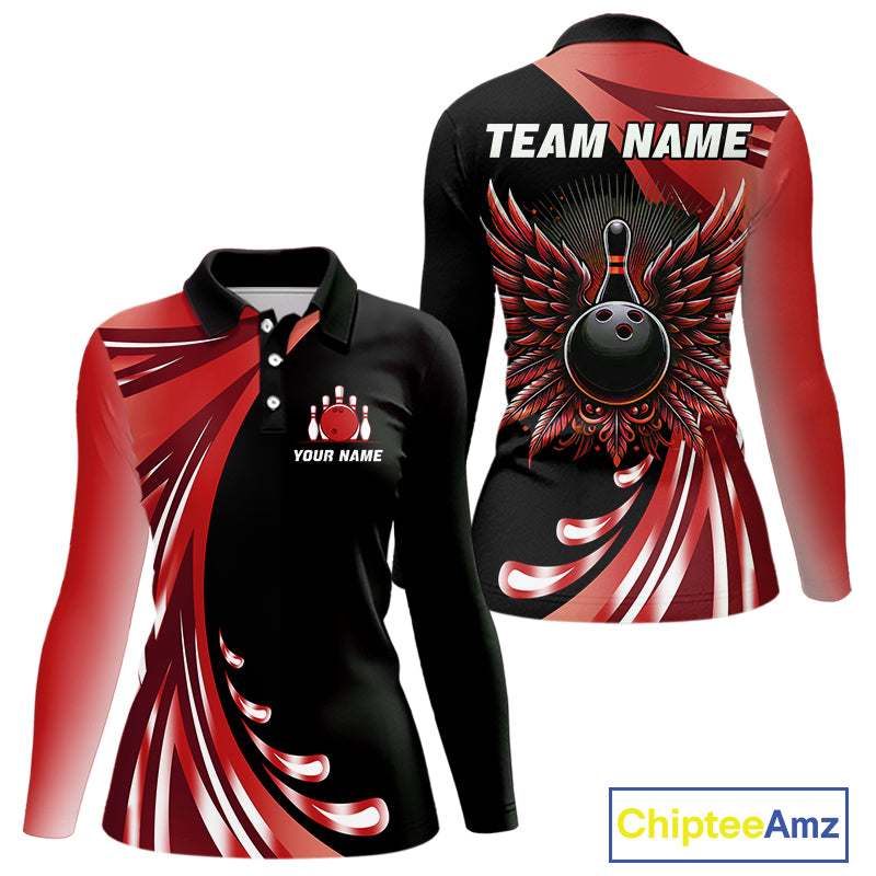 Black and Red Bowling Ball and Pins wings Bowling Shirts for Women Custom Team Bowling Jerseys NQS10491