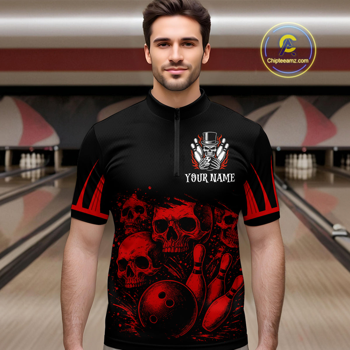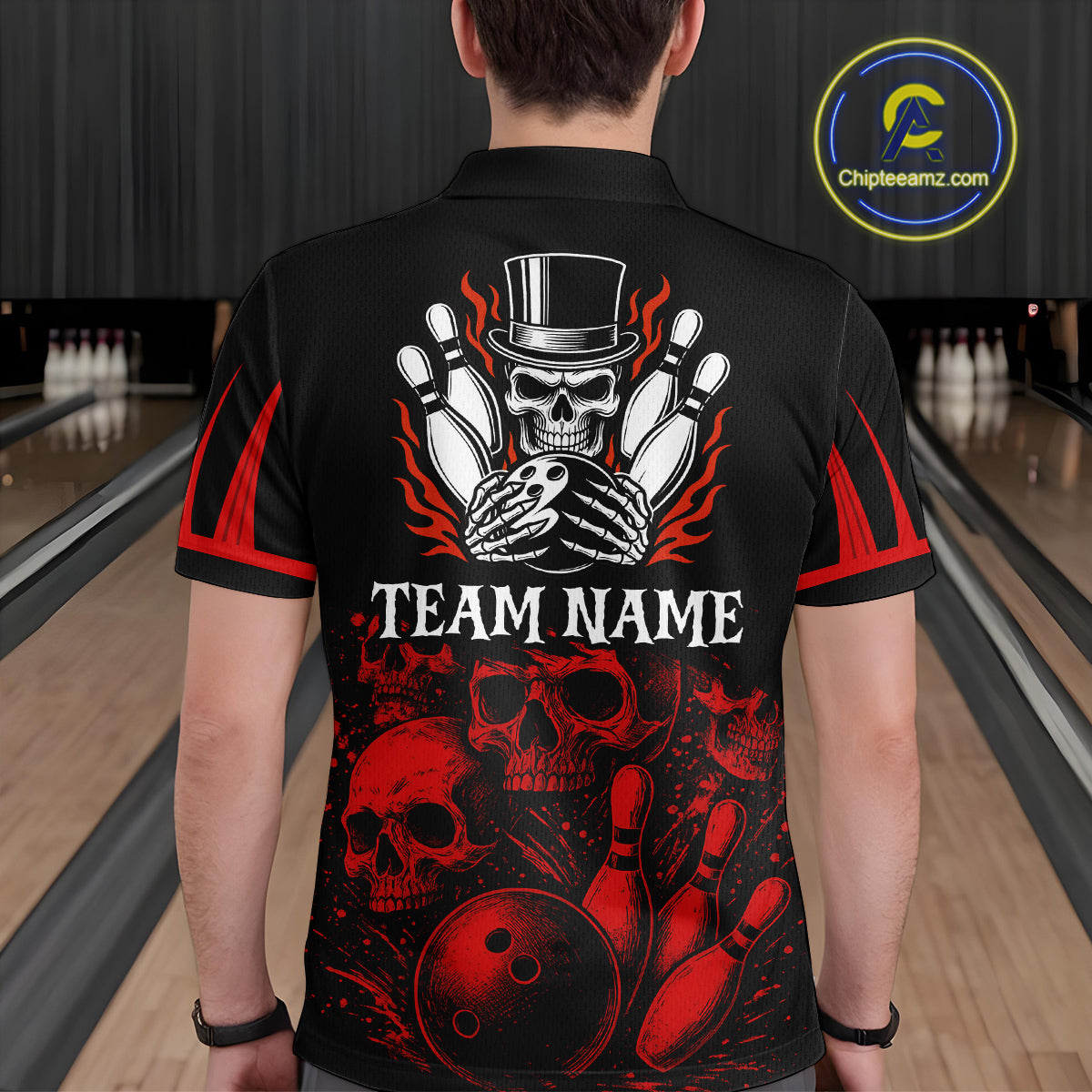 Black and Red Flame Skull Bowling Polo, Quarter Zip Shirts For Men Custom Skull Bowling Team Jerseys NQS9985