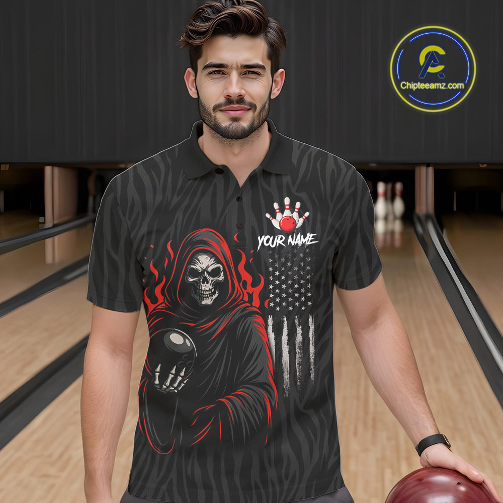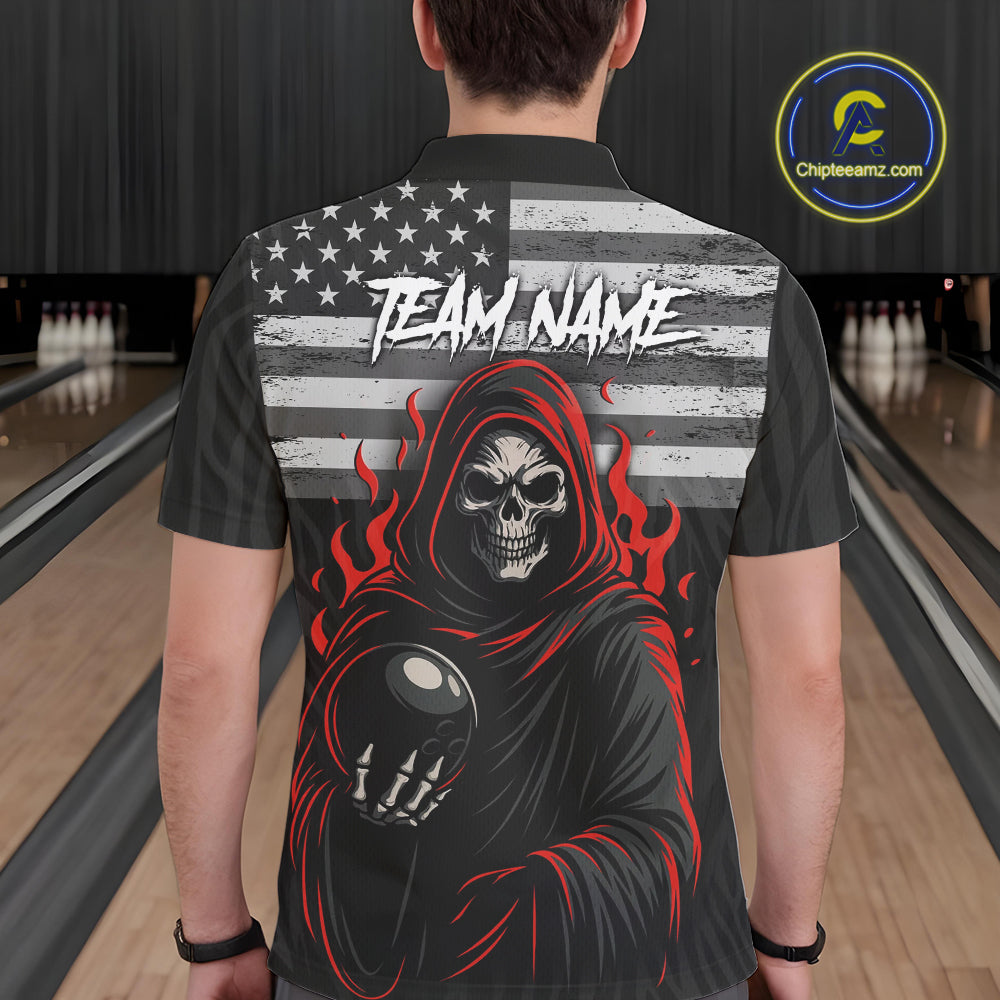 Black & White Camo American Flag Red Flame Skull Reaper Mens Bowling Shirt Custom Team Bowling Jersey NQS10852