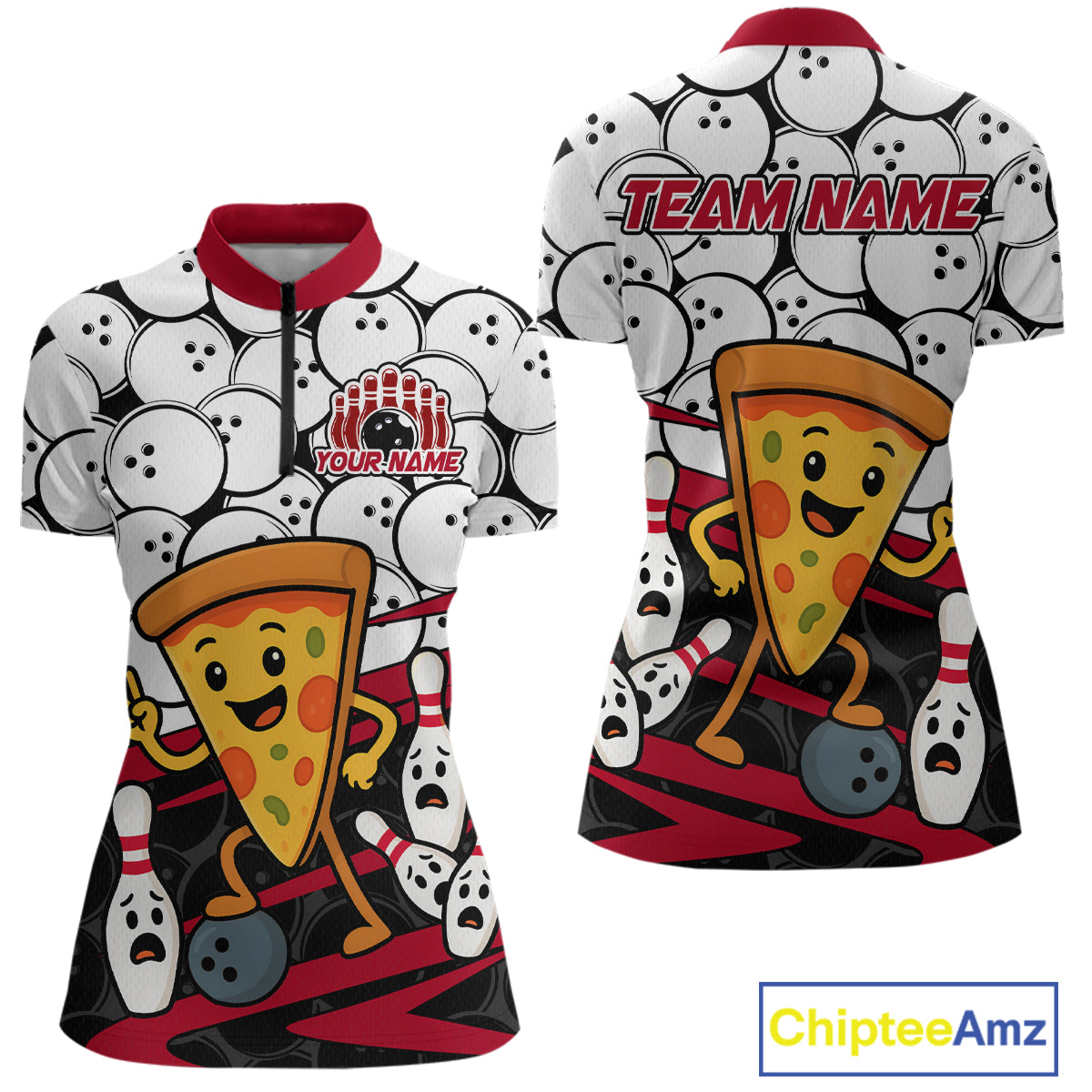 Custom Red Funny Pizza Bowling Shirt Bowling with Food for Women Polo Bowling Jersey QZT799