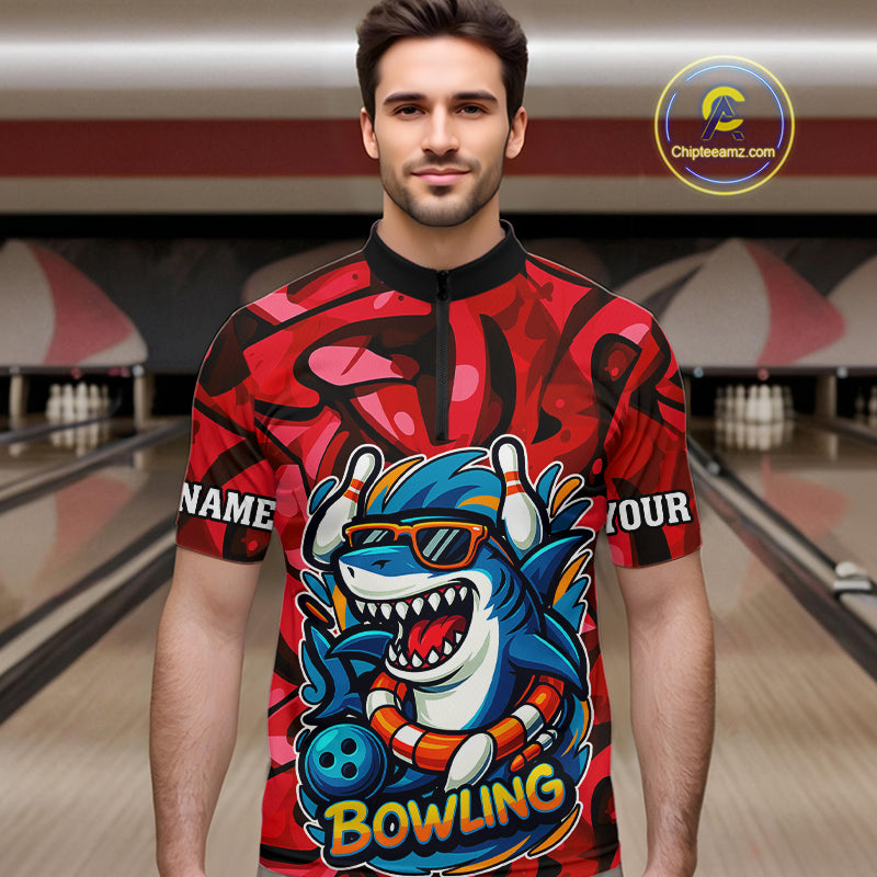 Funny Red Camo Shark Men Bowling Polo, Quarter Zip Shirts Custom Team Shark Bowling Outfit Jersey NQS10076
