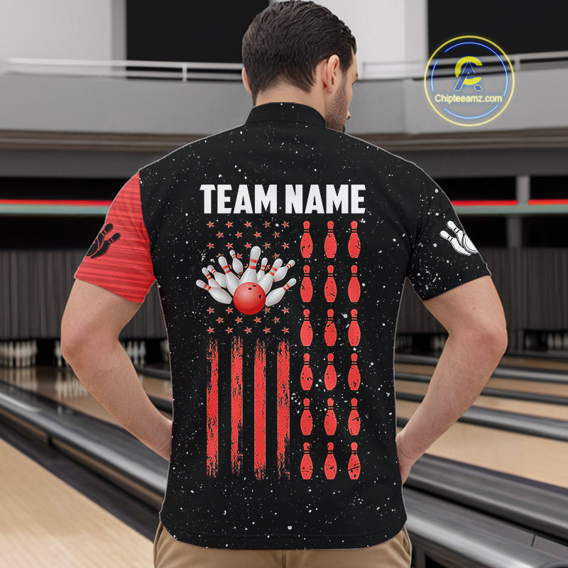 Custom Red Grunge American Flag Bowling Shirt For Men, Patriotic Bowling Team Jersey Polo, 1/4 Zip TDM4633
