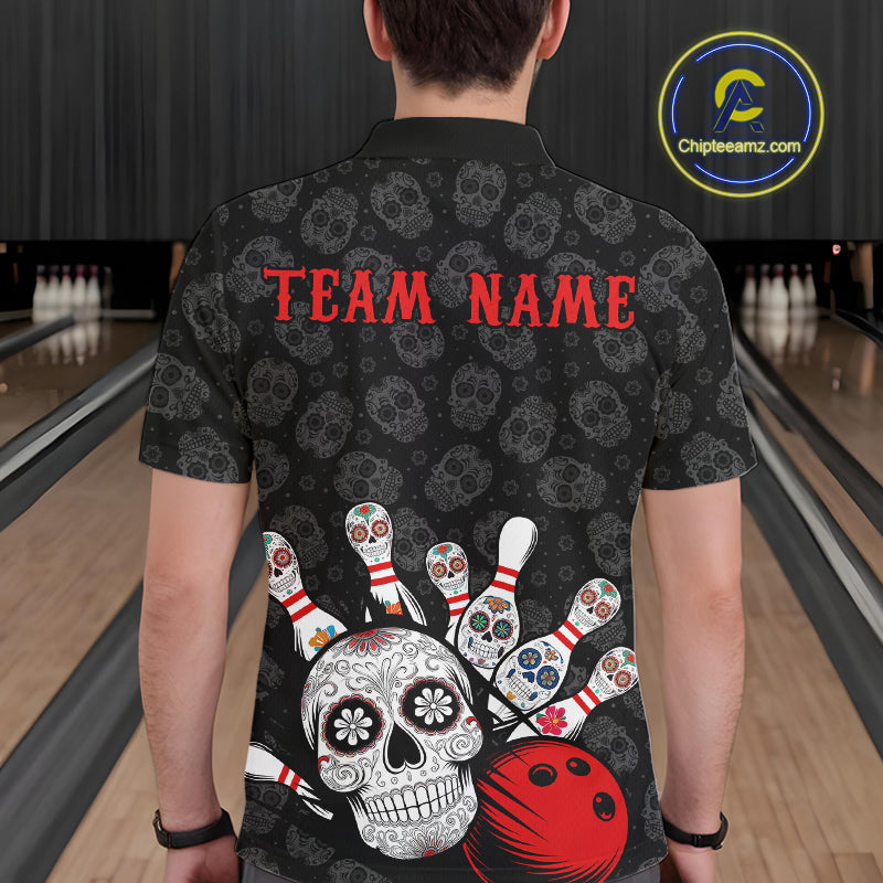 Custom Black And Red Sugar Skull Bowling Team Polo Shirts For Men, Bowling League Shirt IPHW9251