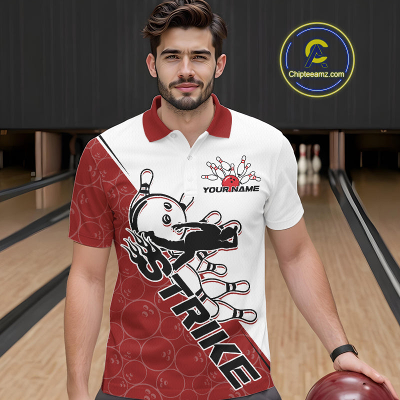 Cusom Red Strike Bowling Team Polo Shirts For Men, Bowling League Shirt Bowlers Outfit IPHW9259