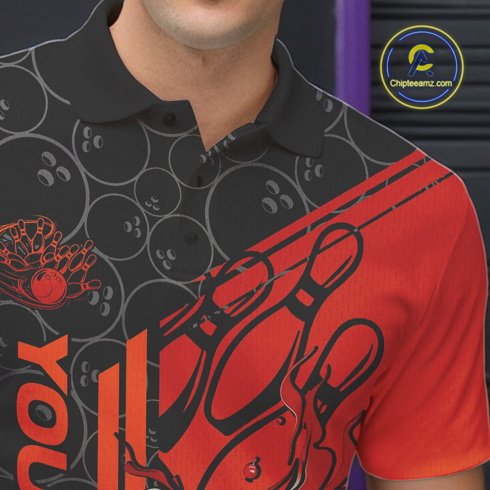 Custom Black And Red Orange Flame Bowling Polo Shirts For Men, Bowling Pattern Shirt IPHW9271