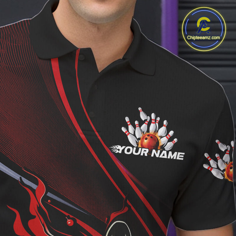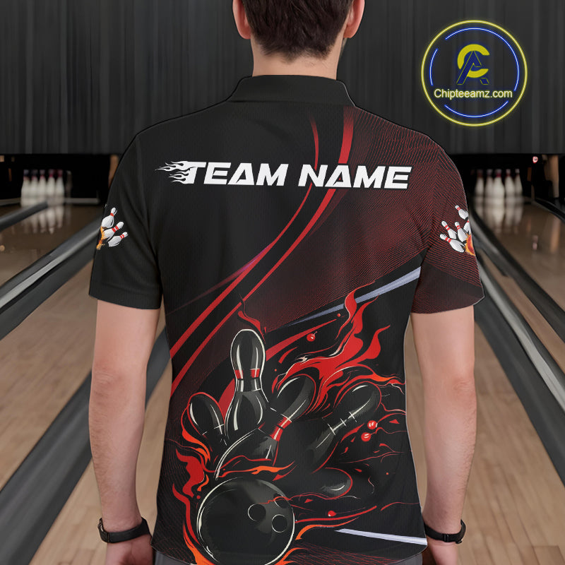Custom Black And Red Fire Flame Bowling Team Men Polo Shirts, Bowling Jerseys IPHW9418