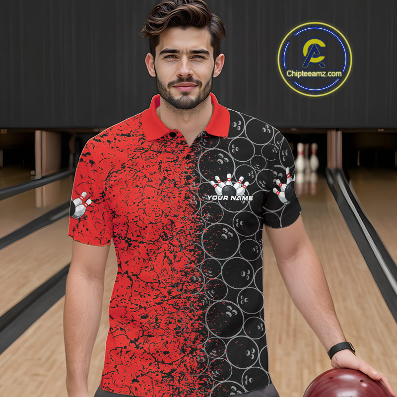 Custom Black And Red Splatter Bowling Ball Pattern Bowling Team Polo Shirts For Men IPHW9790