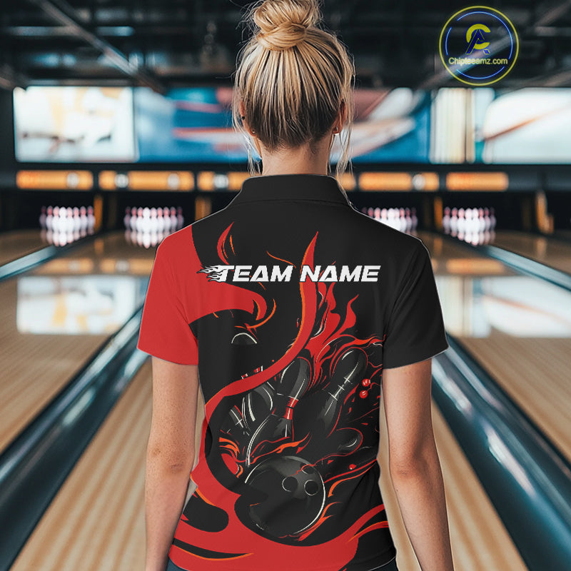 Custom Black And Red Flame Bowling Polo Shirts For Women, Bowling Tournament Team Uniform IPHW9245