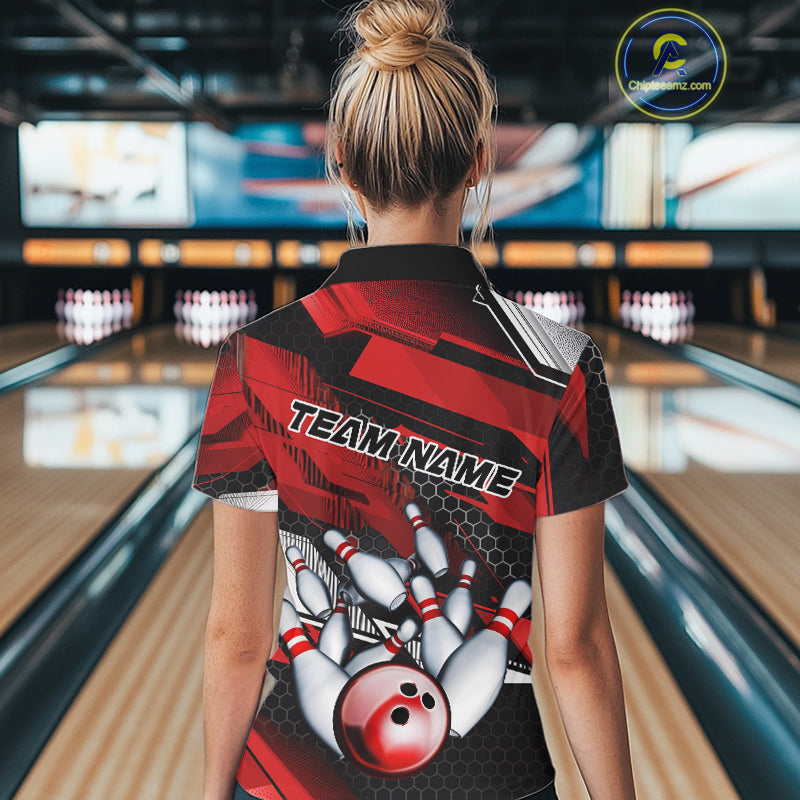 Custom Black And Red Hexagon Pattern Bowling Polo Shirts For Women, Bowling Team Uniform IPHW9420