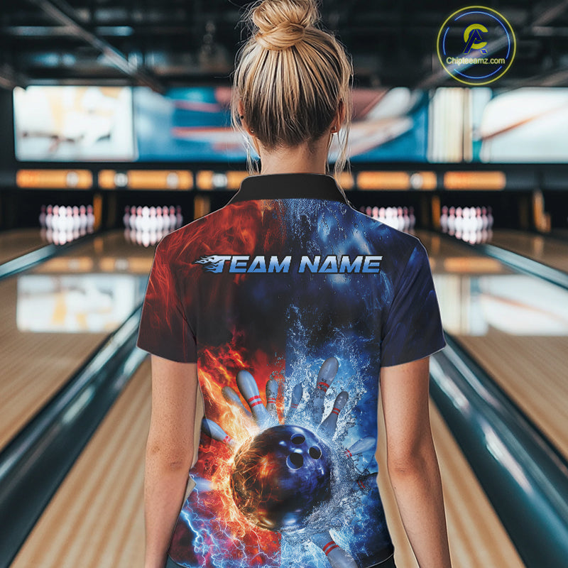 Custom Red Fire Blue Water Explosion Bowling Team Polo Shirts For Women, Bowling Uniform IPHW9448