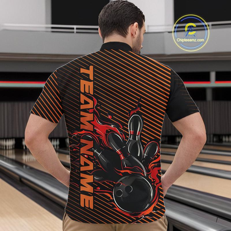 Custom Red Orange Flame Bowling Quarter-Zip Shirts For Men, Bowling Tournament Team Shirt IPHW9403