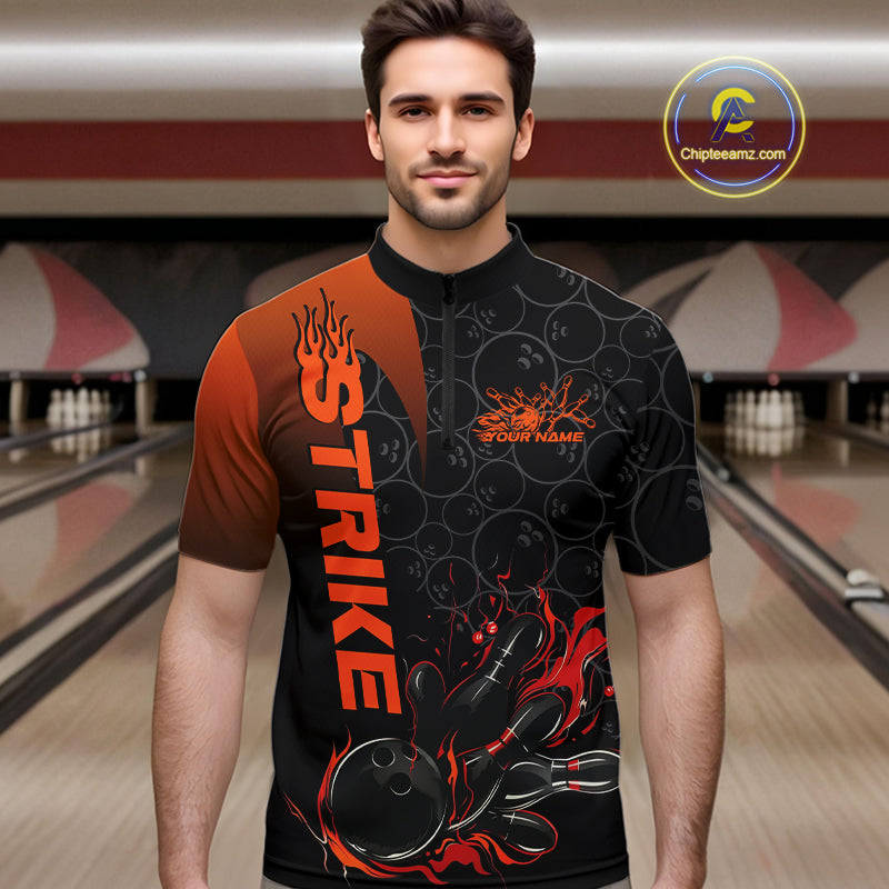 Custom Bowling Pattern Red Flame Strike Bowling Team Men Quarter-Zip Shirts, Bowling Jerseys IPHW9415
