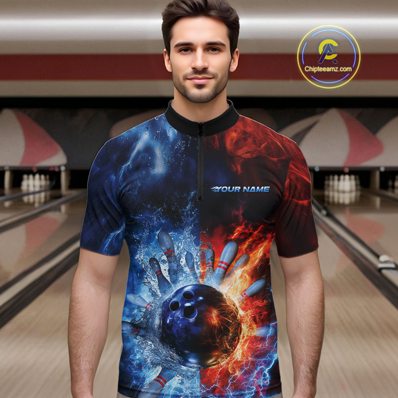 Custom Red Fire Blue Water Explosion Bowling Team Quarter-Zip Shirts For Men, Bowling Uniform IPHW9448
