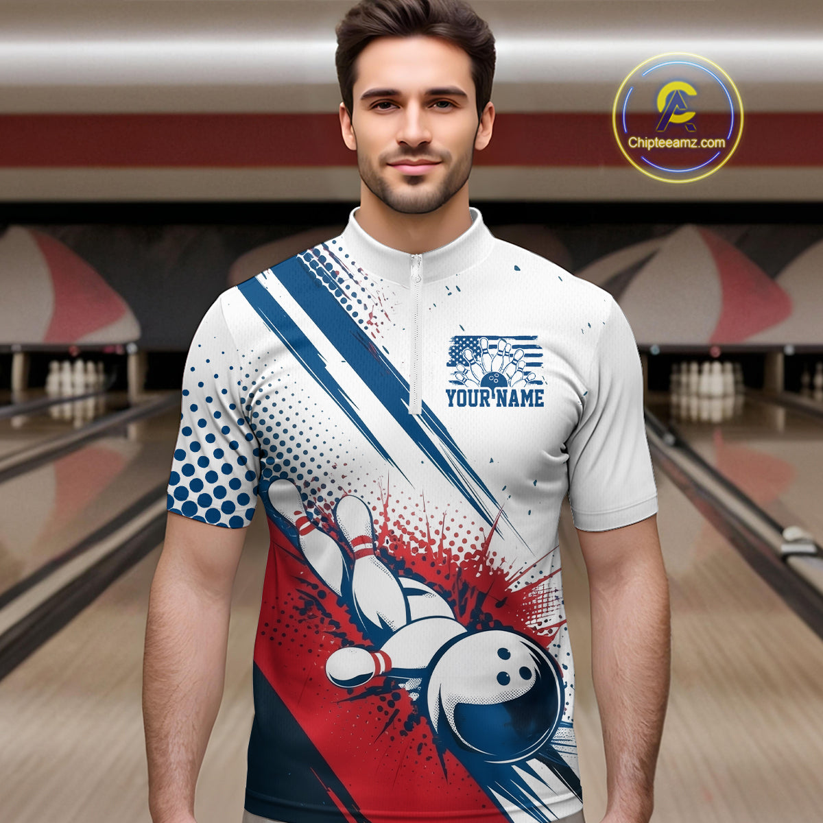 Custom Red, White And Blue Patriotic US Flag Bowling Quarter-Zip Shirts For Men, Team Uniform IPHW9542