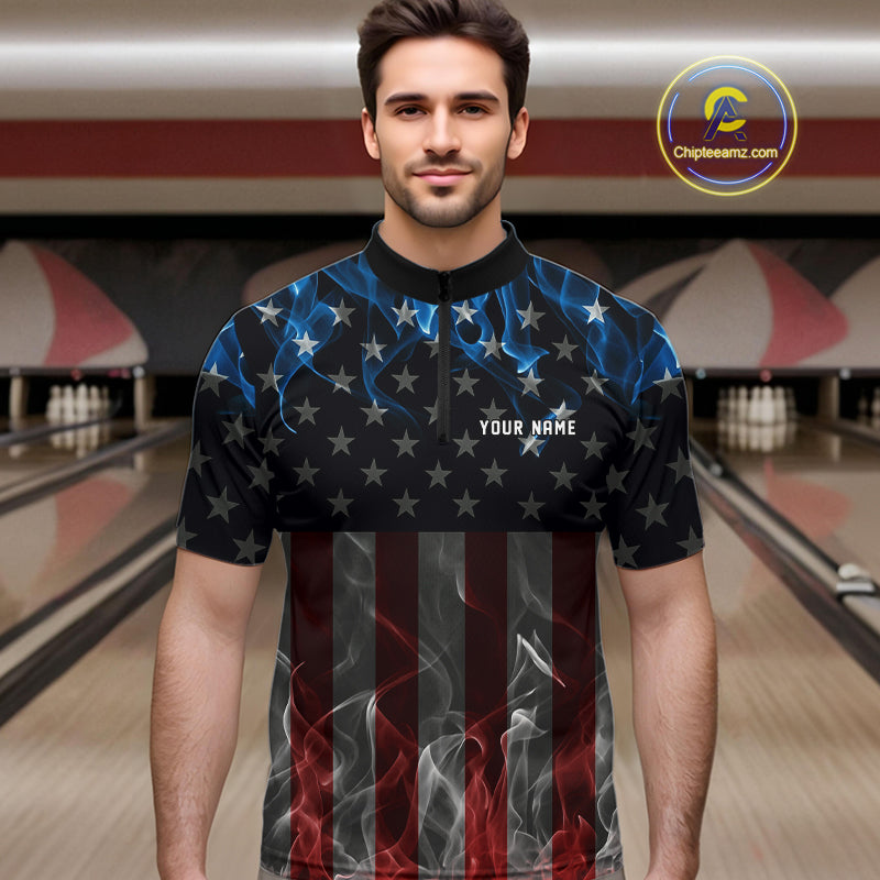Custom Red And Blue Flame American Flag Patriotic Bowling Men Quarter-Zip Shirts, Team Uniform IPHW9715