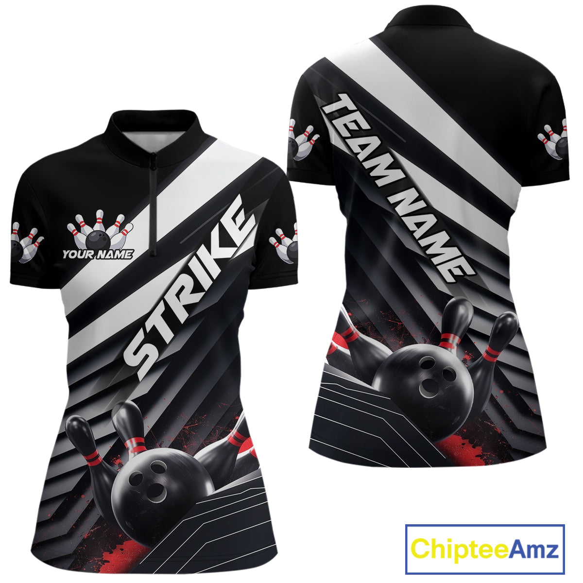 Custom Black And Red Strike Bowling Quarter-Zip Shirts For Women, Bowling Team Uniform IPHW9627