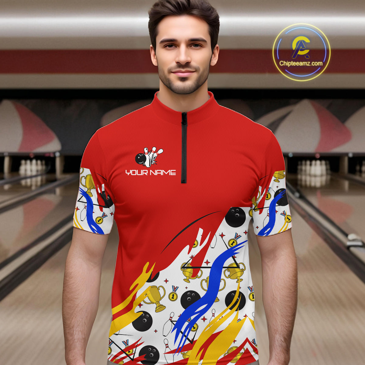 Red Bowling pattern Bowling Team Polo, Quarter Zip Shirt For Men Custom Mens Bowling Jersey NQS10825