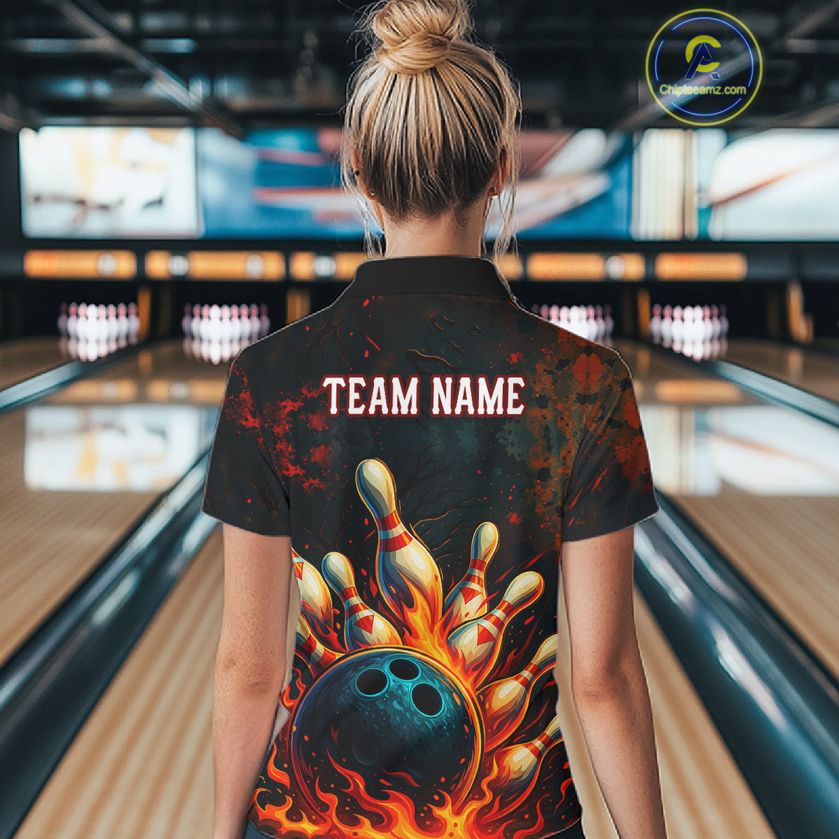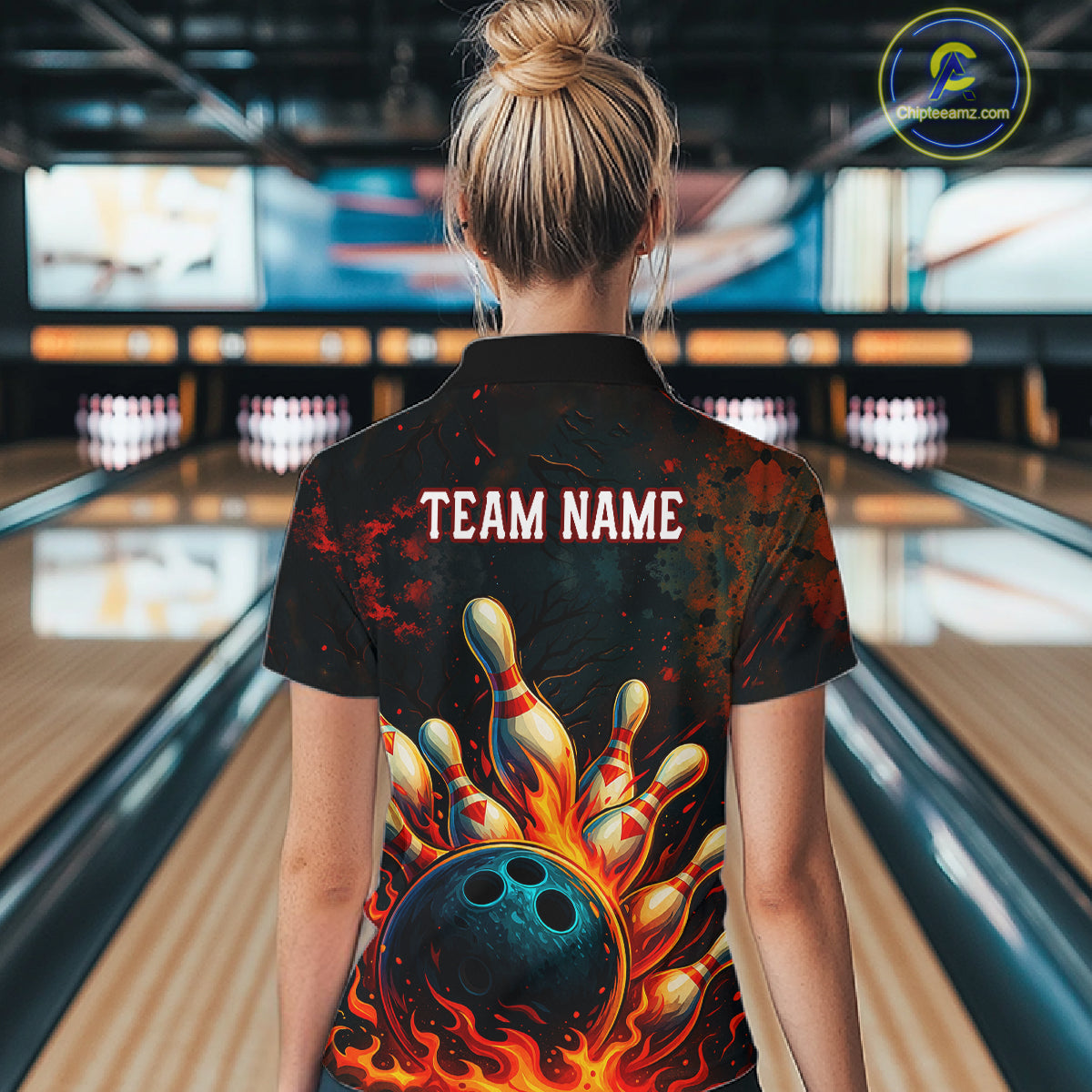 Red Flame Bowling Polo, Quarter Zip Shirts for Women Custom Team Bowling Outfit, Gift for Bowlers NQS10752