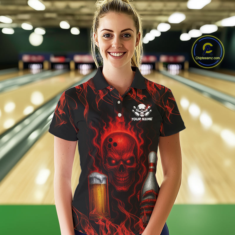 Red Skull and Beer Bowling shirts with flames Custom Bowling Polo, 1/4 Zip bowling outfits for Women NQS10955