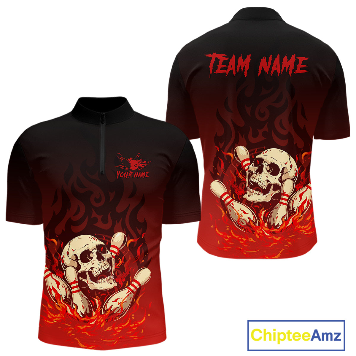 Red Skull Bowling Shirts With Flames custom quarter zip, polo team jerseys, bowling jerseys men NQS10998