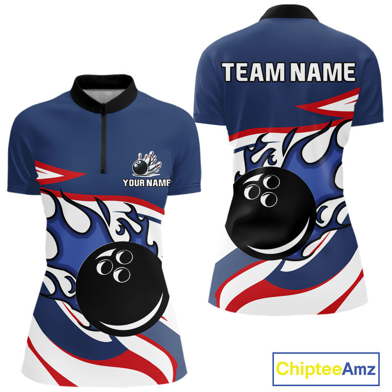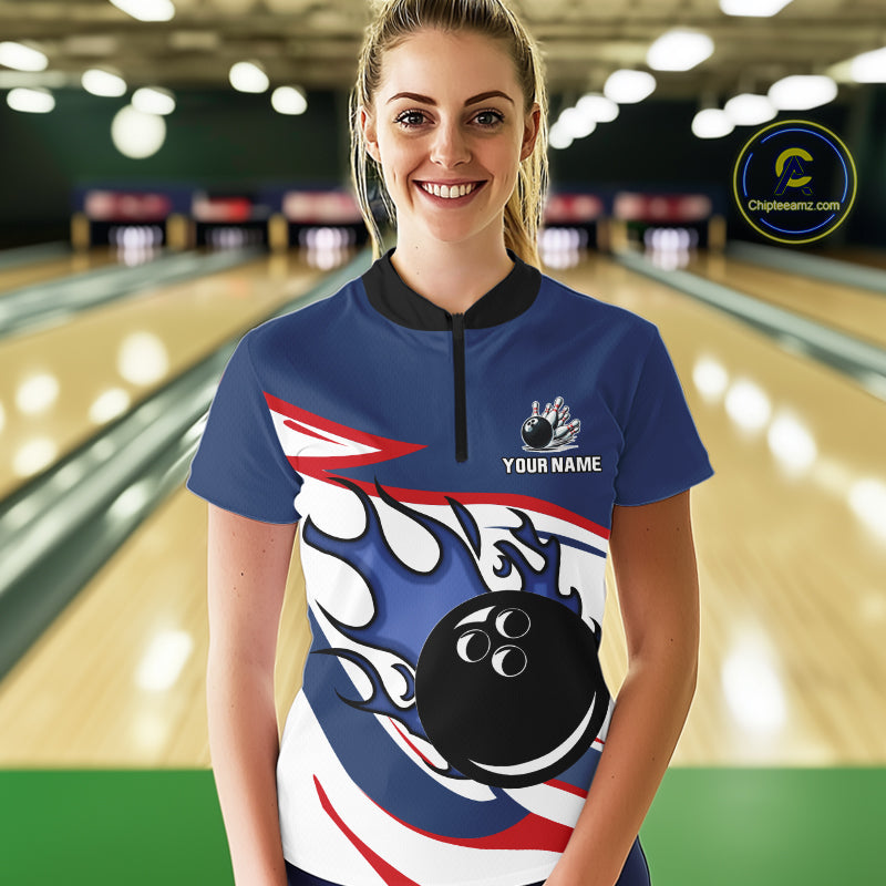 Red, White and Blue Flame bowling ball polo, 1/4 zip shirts for Women Custom patriotic Bowling Outfit NQS10045