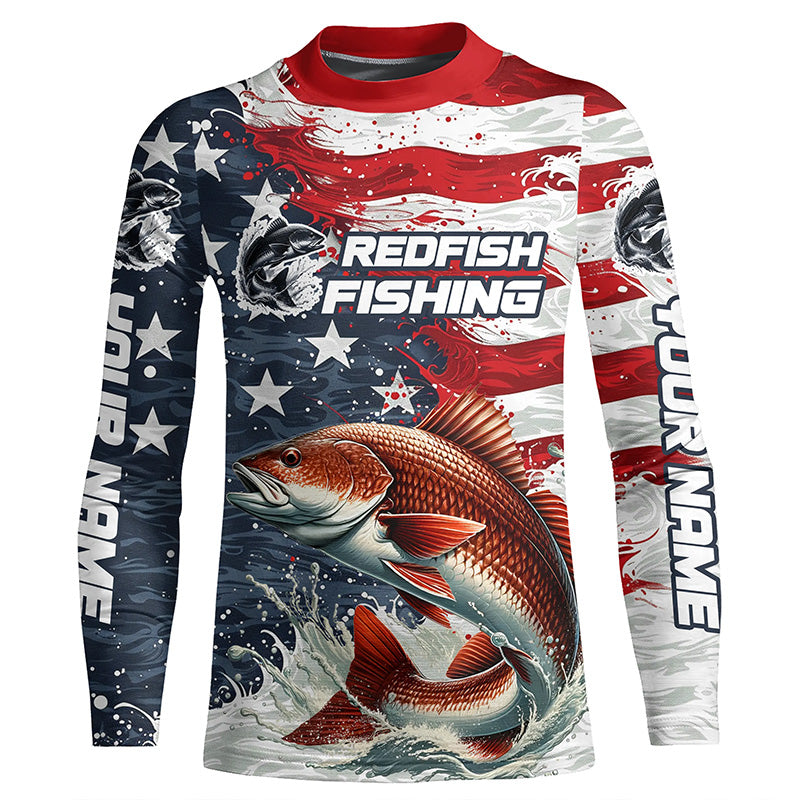 Custom Redfish Fishing American Flag Long Sleeve Fishing Shirts, Patriotic Redfish Fishing Shirts IPHW6824