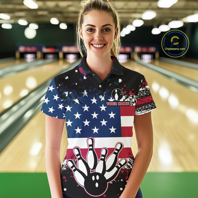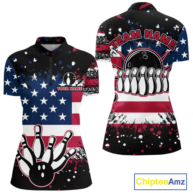 American Flag Black Bowling Polo, 1/4 Zip Shirts For Women custom patriotic retro bowling team shirts NQS10210