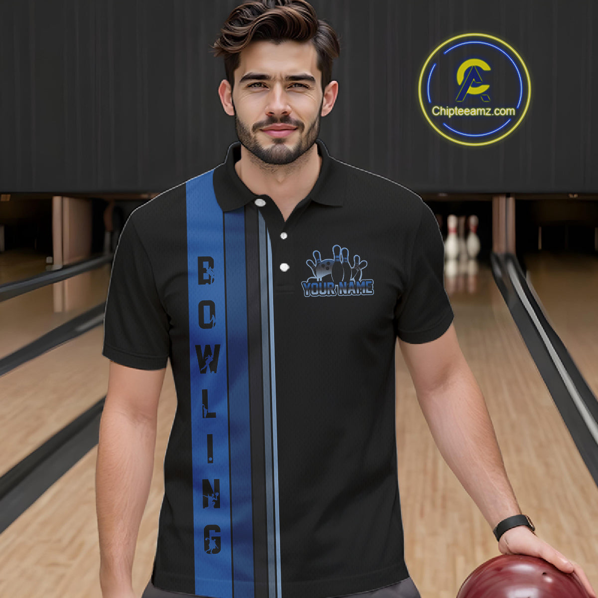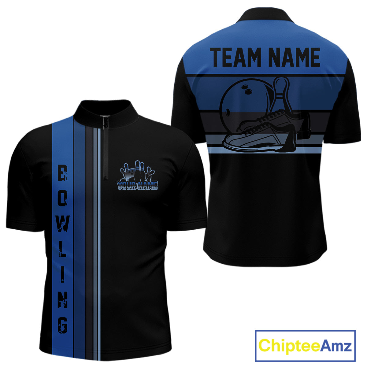 Black and Blue Retro Bowling Polo, Quarter Zip Shirts for Men Custom Team Bowling League Jerseys NQS10746
