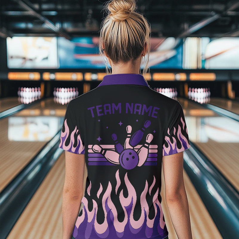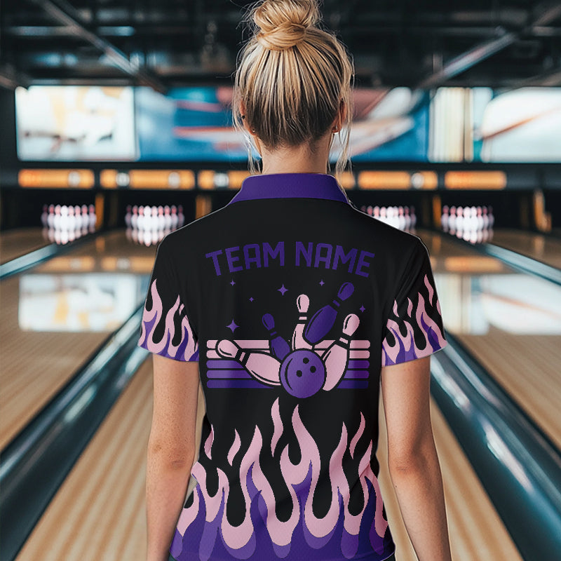 Black and Purple Flame Retro Bowling Polo, Quarter Zip Shirt for Women Custom Bowling Team Jerseys NQS9427