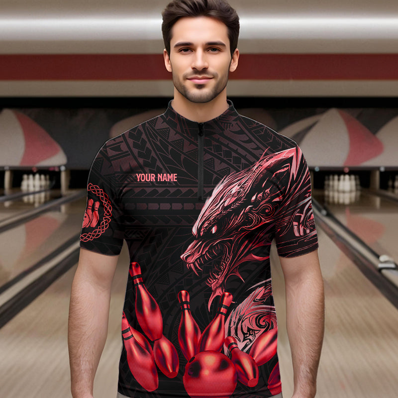 Black and Red Dragon Tribal Bowling Polo, 1/4 Zip Shirts For Men Custom Retro Bowling Team Jerseys NQS9629