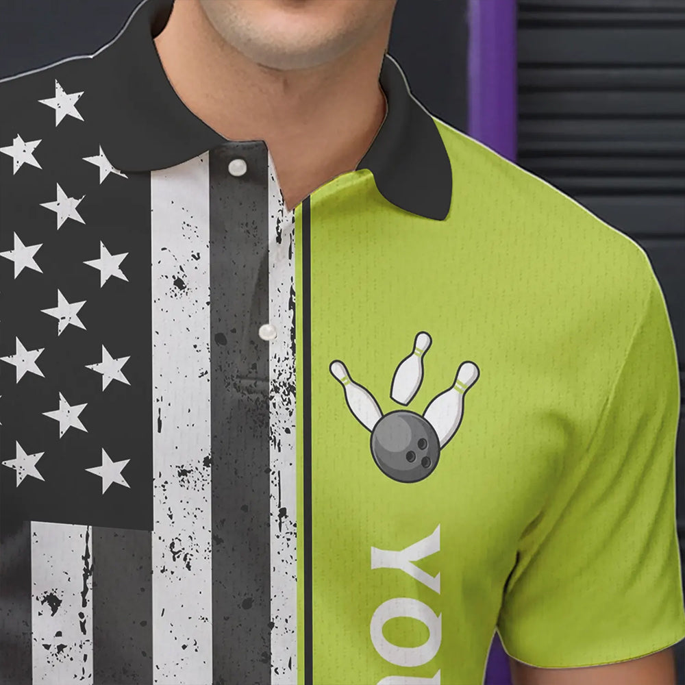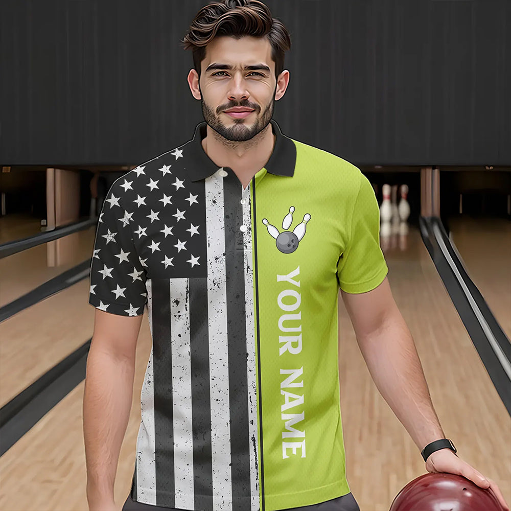 Black White Retro American Flag Bowling Shirts For Men Custom Patriotic Bowling Team Jersey | Green NQS9638