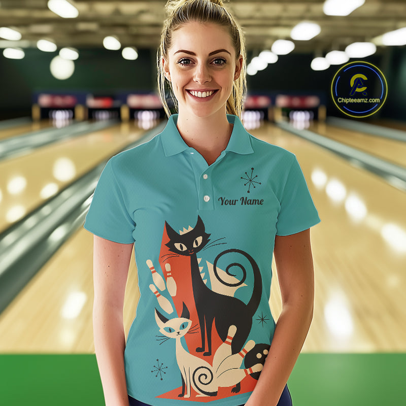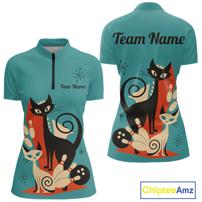 Custom retro bowling shirts Cats Bowling jersey for Women Team Bowling Polo, 1/4 Zip Shirts | Blue NQS11072