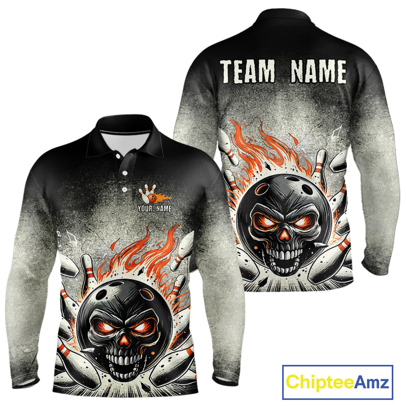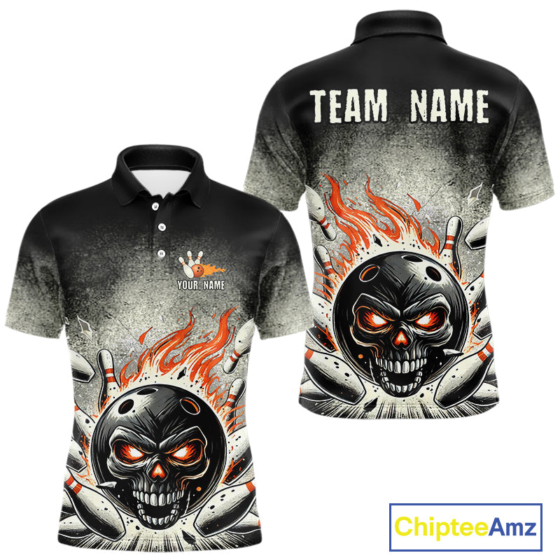 Funny Flame Skull Bowling Ball and Pins Retro Black Bowling Shirt For Men Custom Bowling Team Jersey NQS9794