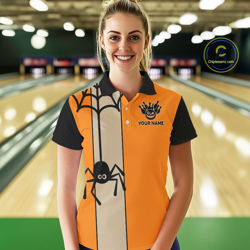 Orange and Black Halloween Retro Bowling Polo, 1/4 Zip Shirts For Women Custom Bowling Team Shirt NQS10464