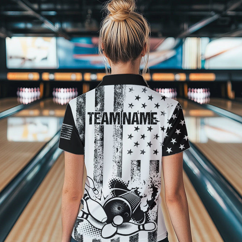 Personalized Black & White American Flag Retro Bowling shirt for Women, Patriotic Bowling Team Jersey NQS9567
