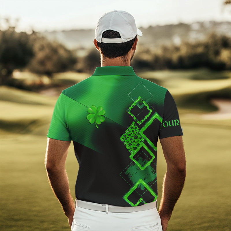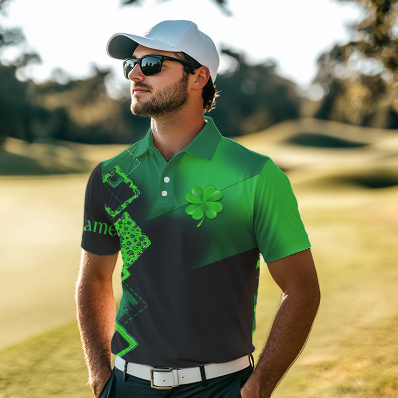 Mens golf polo shirt custom name green clover St Patrick day golf shirts, golfing gifts | Black NQS9514