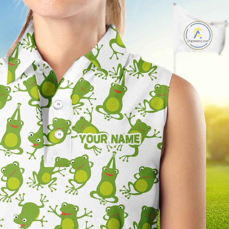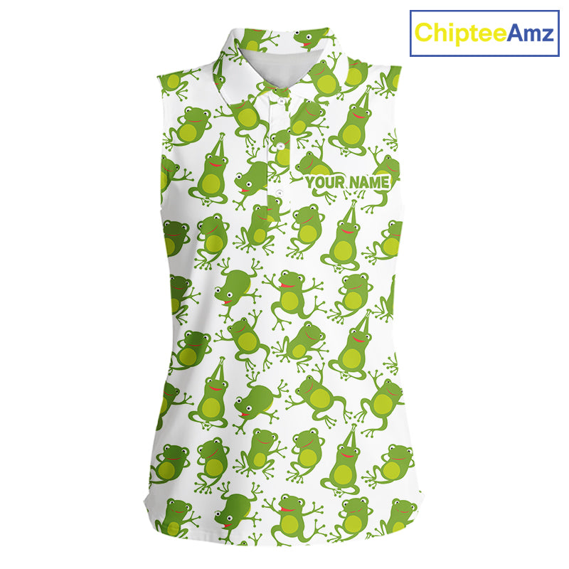Funny Green Frog pattern Women Sleeveless polo shirt Custom golf attire for ladies, gift for golfers NQS11285