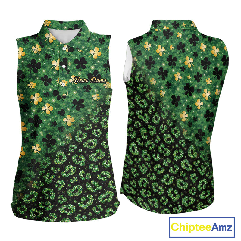 Green and Gold Clover glitter leopard St Patrick's day pattern custom ladies sleeveless golf tops NQS11423