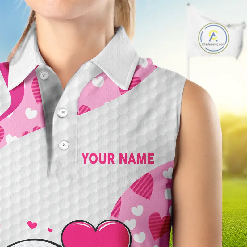 Personalized funny golf ball pink heart pattern white Sleeveless Golf Polo Shirt, Valentine golf gift NQS11324