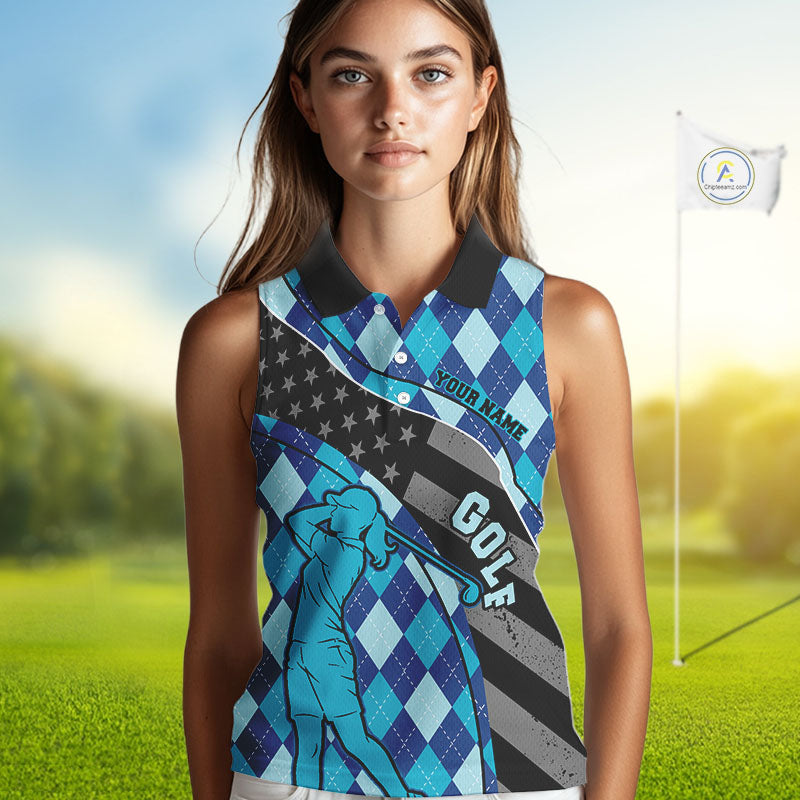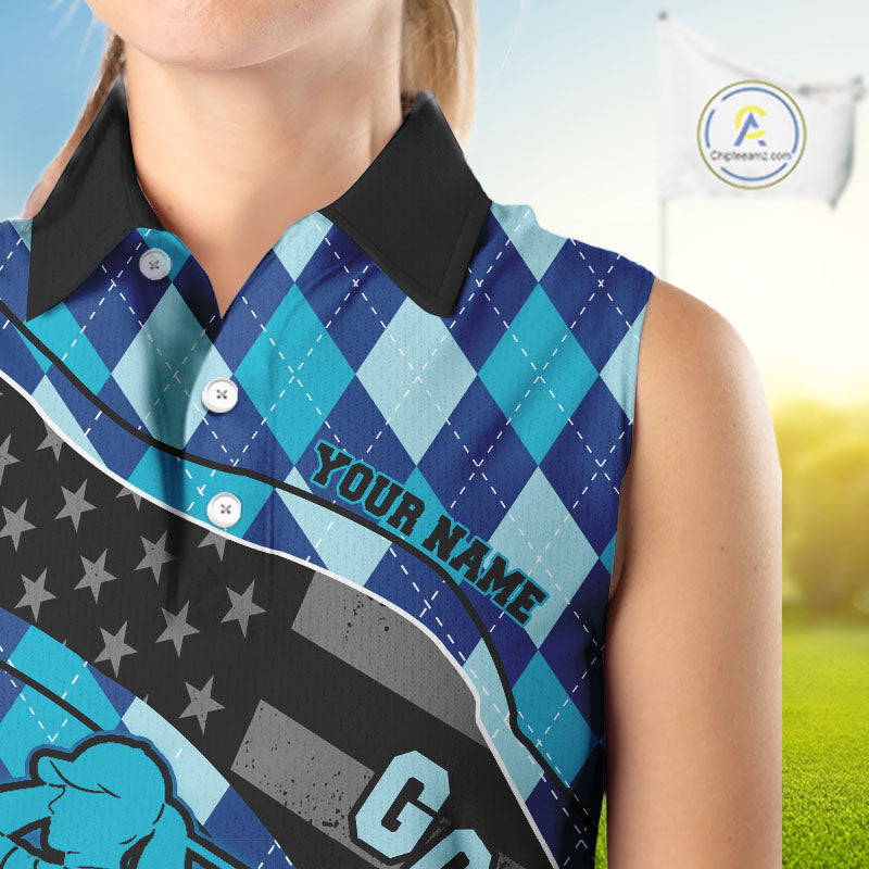 Personalized womens golf shirts sleeveless blue argyle pattern American Flag patriotic golf shirts NQS11368