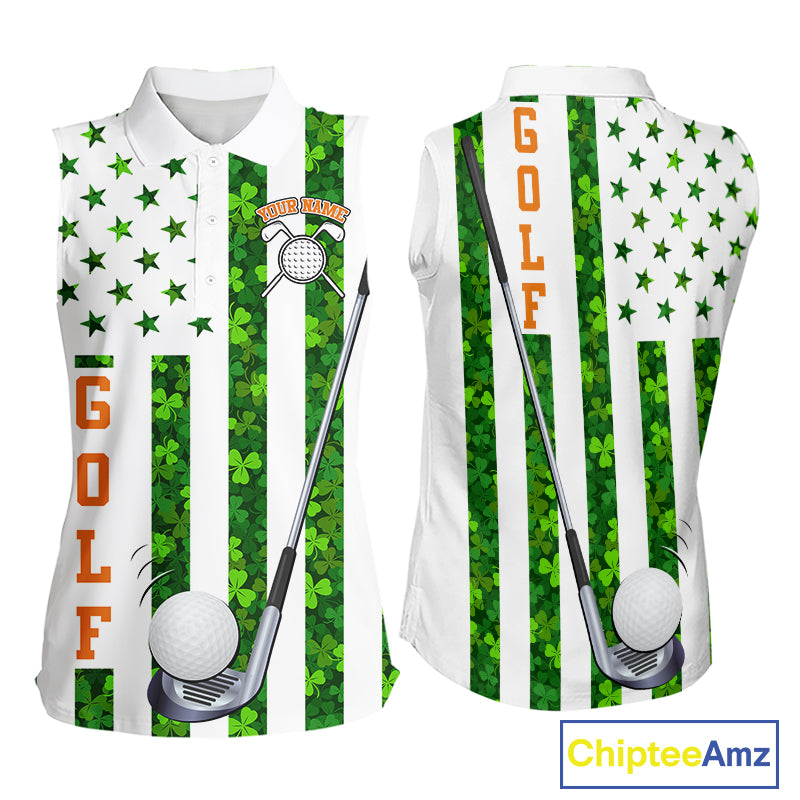 White, Green and Orange shamrock American Flag Sleeveless polo shirts Custom St Patrick golf outfit NQS11297