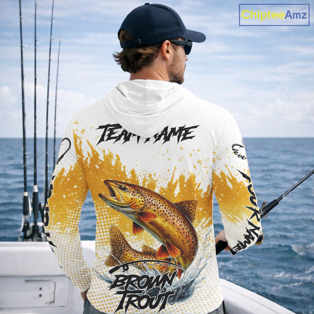 Custom Brown Trout Long Sleeve Hooded Fishing Shirts Yellow Camo Fishing Lures, Custom Fishing Jerseys NBT377