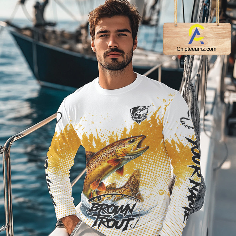 Custom Brown Trout Long Sleeve Fishing Shirts Yellow Camo Fishing Lures, Custom Fishing Jerseys NBT377