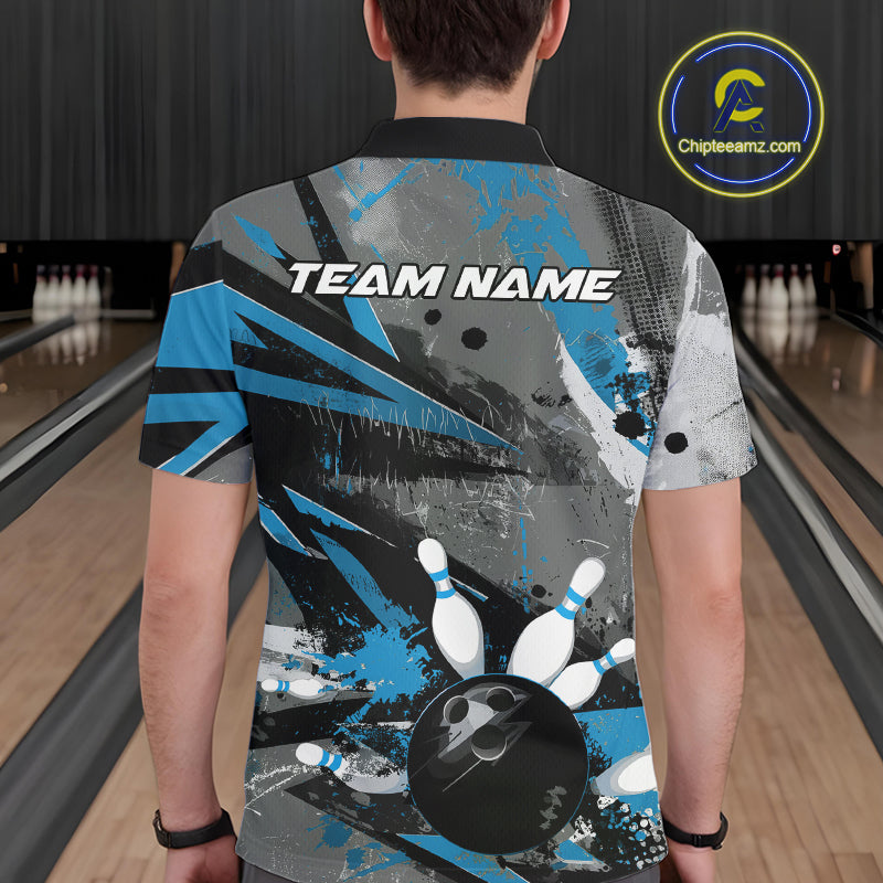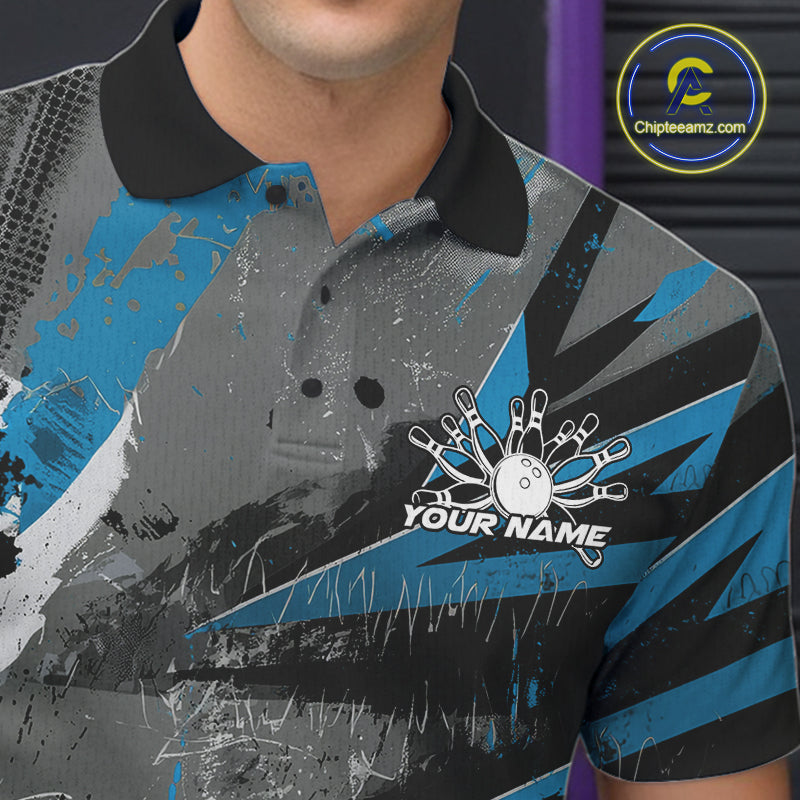 Custom Grunge Blue Bowling Polo Shirts For Men, Vintage Bowling Team Shirts IPHW9512