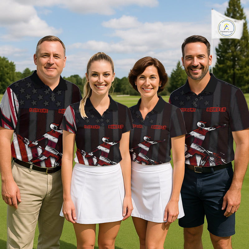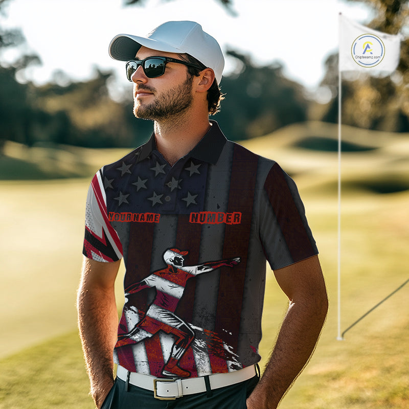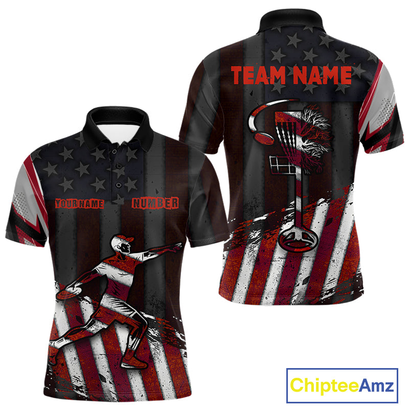 Mens Disc Golf Polo Shirt Custom Name Vintage American Flag Disc Golf Basket Patriotic Golf Shirts  NHN0029