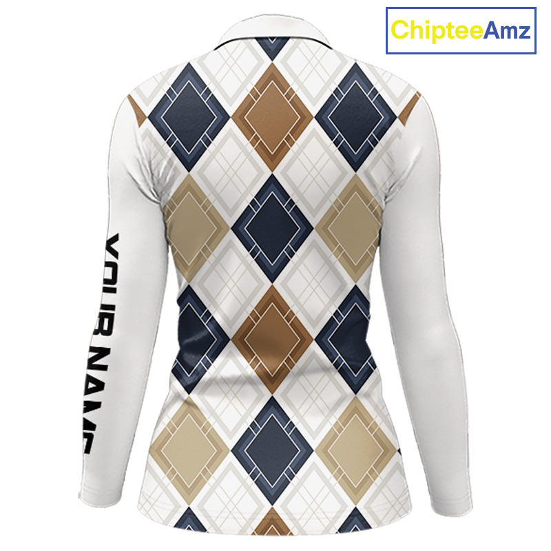 Plaid Womens Long Sleeve Golf Polo Shirt Custom Retro Argyle Pattern Team Golf Tops, Vintage Golf Gift NHN0216