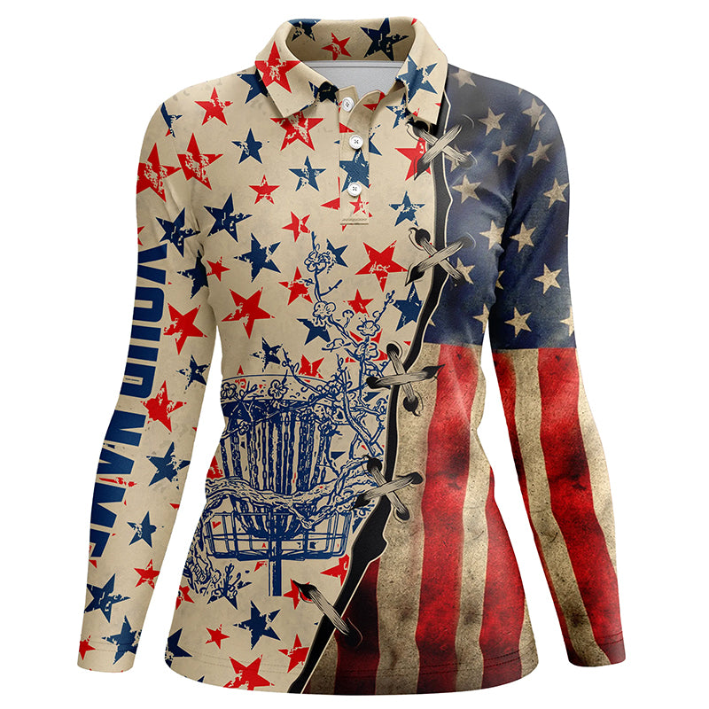 Vintage American flag disc golf basket Womens disc golf polo shirt, personalized disc golf shirts NQS5678