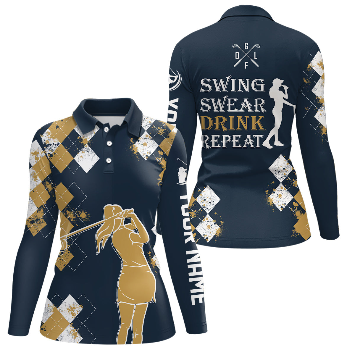 Yellow agryle pattern Womens golf polo shirts custom swing swear drink repeat vintage ladies golf|Navy NQS6910