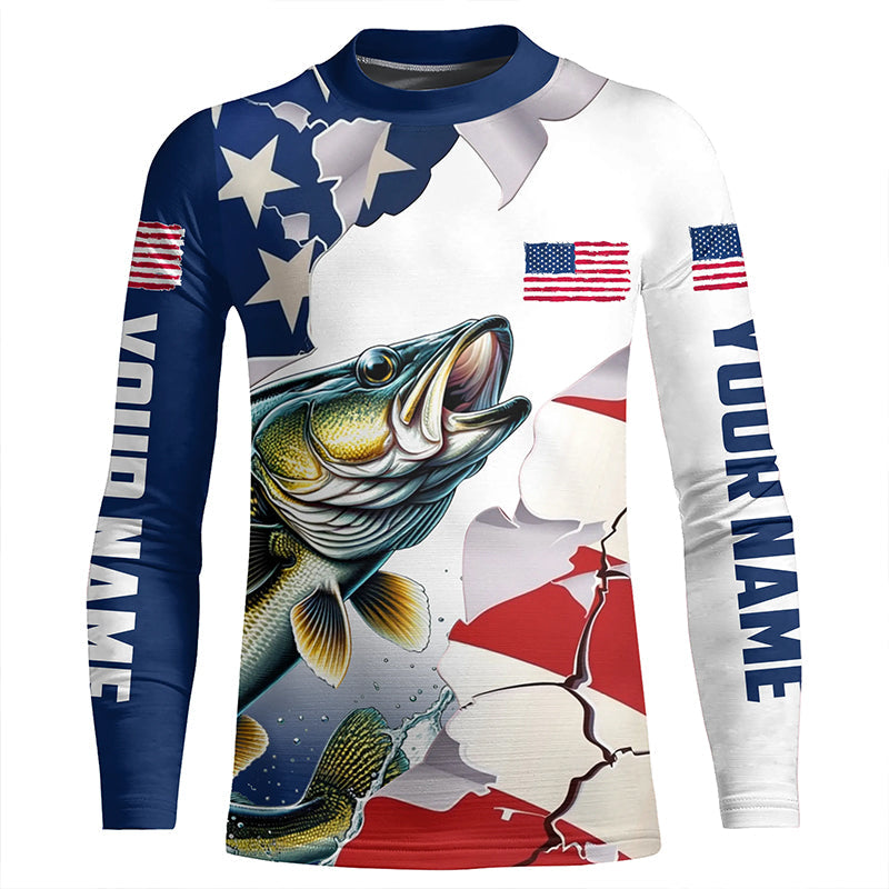Personalized American Flag Walleye Fishing Long Sleeve Shirts, Patriotic Walleye Fishing Jerseys IPHW6107
