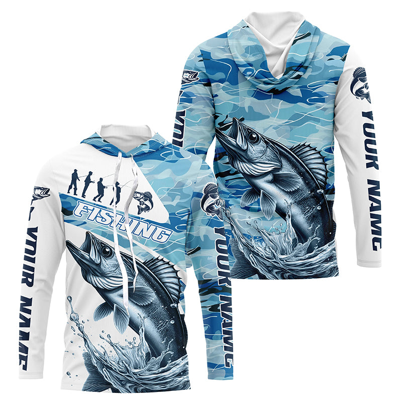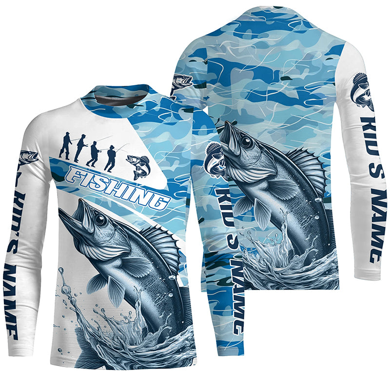 Walleye Fishing Custom Long Sleeve Tournament Shirts, Blue Camo Walleye Fishing Jersey For Fisherman IPHW6319